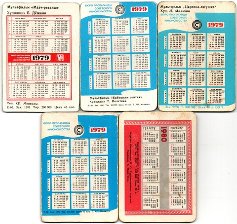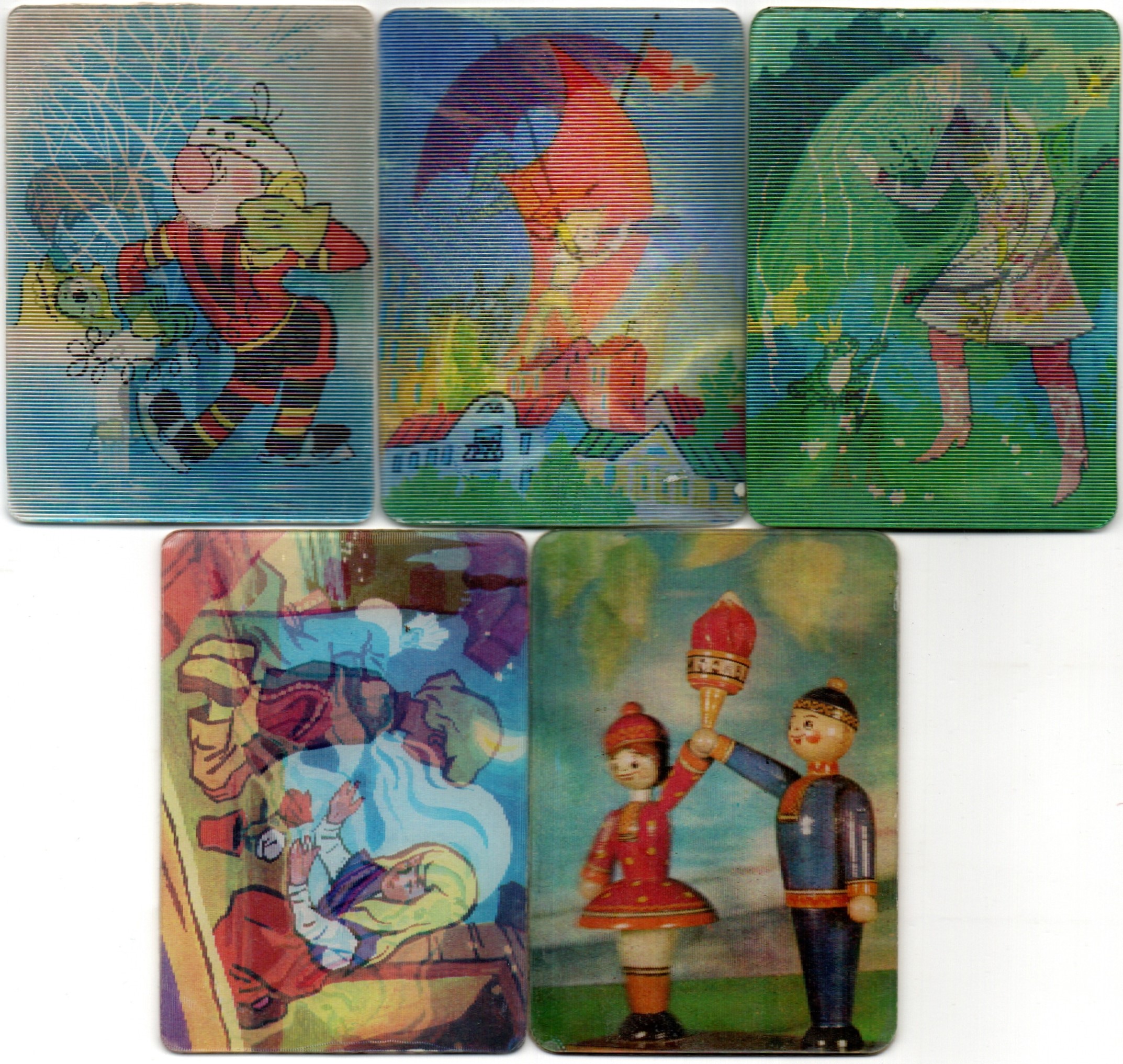 № 41 Набор из 5 стерео Календариков. Мультфильмы СССР 1980 г. Календарик Стерео мультфильмы : Царевна - лягушка / куклы в национальных костюмах / Бабушкин зонтик / Снежная королева / Матч - реванш. .Карманный календарик переливной объемный 3D. СССР. Художники СССР. Состояние на фото