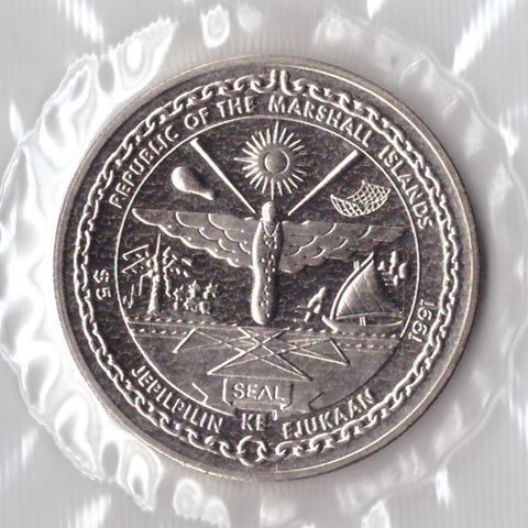 Аверс: В центре изображён герб Республики Маршалловы Острова, представляющий собой круглый диск с ангелом в обрамлении двух сцепленных цепей. Вдоль внешнего края диска сверху название государства на английском языке «REPUBLIC OF THE MARSHALL ISLANDS», снизу — девиз на маршалльском яз. «JEPILPILIN KE EJUKAAN», переводится как «Достижение через общее усилие». От головы ангела вверх расходятся два луча, между которыми располагается двадцатичетырёхконечная звезда. Над крыльями ангела справа изображена рыболовная сеть, слева — орудие из малюска. Под крыльями: справа — каноэ, слева — кокосовые пальмы. Под ангелом помещено изображение традиционной маршалльской навигационной карты в перспективе, под ней надпись на ленте «Seal», в переводе с англ. яз. «Печать».
