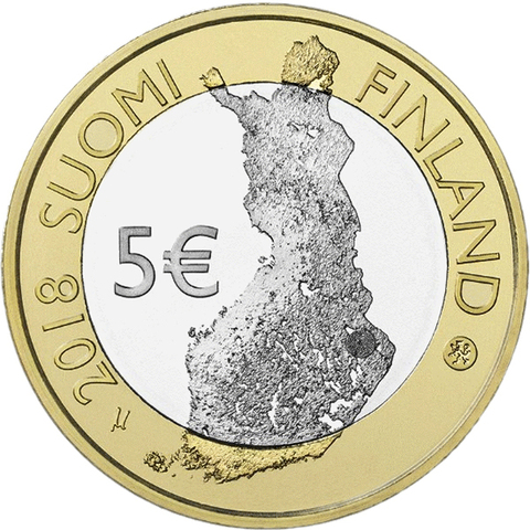 Аверс: в центре монеты изображена карта Финляндии и указан номинал "5 €"; во внешнем сегменте надписи: слева - "2018" и "SUOMI", справа - "FINLAND", внизу справа - знак финского монетного двора, внизу слева знак автора монетного проекта.
