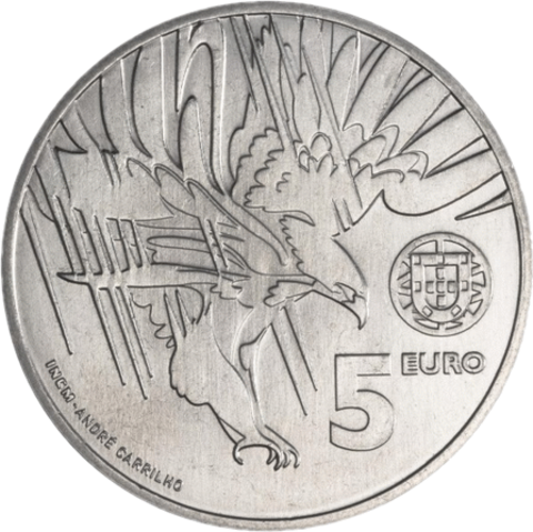 На аверсе: в центре пикирующий орел. Справа по центру герб Португалии. Ниже номинал «5 EURO».