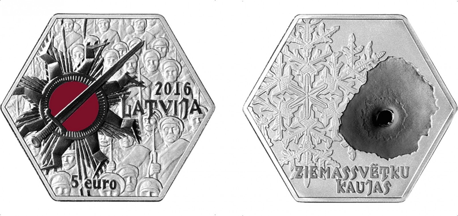 Реверс: снежинка, след от пули, надпись на латыш. ZIEMASSVĒTKU KAUJAS — «Рождественские бои».