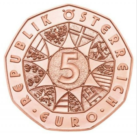 Аверс: в центре указан номинал «5», по кругу, вокруг номинала монеты, расположены 9 гербов Федеральных земель Австрии. Надписи по окружности: «REPUBLIK ÖSTERREICH» (вверху) и «EURO» (внизу).