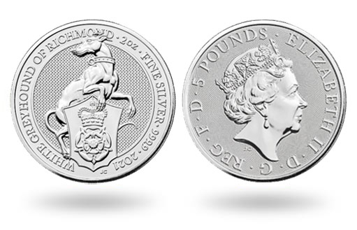 5 фунтов Белая борзая Ричмонда. Звери Королевы. Великобритания 2021г. серебро
