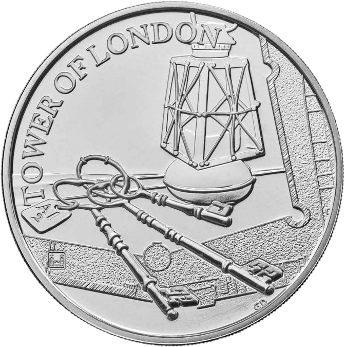 На реверсе монеты: ключи и лампа, расположенные по центру церемонии, перекрывающие часть стен Башни, что создает план Лондонского Тауэра. Надписи: слева вверху надпись «TOWER OF LONDON», справа внизу знак автора монетного проекта “GD”.