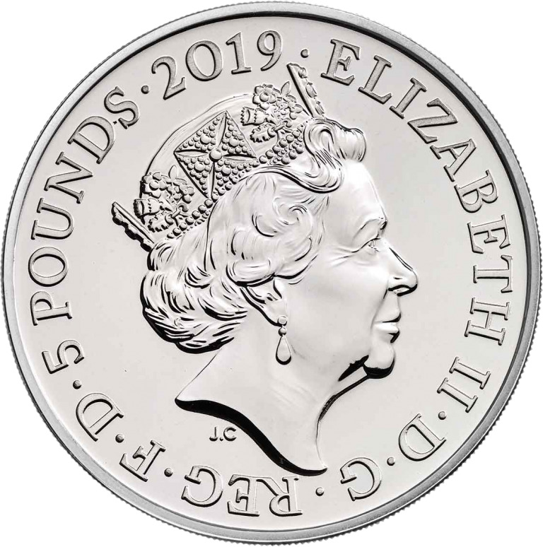 На аверсе монеты: в центре портрет Елизаветы II, разработанное гравером Королевского монетного двора Джоди Кларком и используемое на всех монетах Великобритании с 2015 года. По внешнему кругу надпись: «• 5 POUNDS • 2019 • ELIZABETH II • D • G • REG • F • D • » и знак автора под обрезом портрета «J.C».