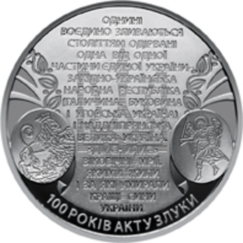 Монеты посвященная торжественному провозглашению акта об объединении Украинской Народной Республики и Западноукраинской Народной Республики в единое независимое государство. 22 января 1919 года в торжественной обстановке на Софийской площади в Киеве состоялось событие, ставшее итогом соответствующего подготовительного процесса, - был провозглашен Акт Злуки, акт объединения украинских земель, в котором отмечалось, что отныне украинский народ, освобожденный могучим порывом своих собственных сил, имеет возможность объединить усилия всех своих сыновей строить нераздельное самостоятельное Украинское государство на добро и счастье украинского народа.