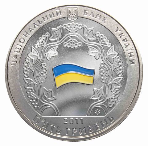На аверсе монеты в центральной части изображен развевающийся флаг Украины, отделанный эмалью национальных голубо-желтых цветов. Флаг окружает стилизированная ветвь калины. Вверху находится надпись “Національний банк України”, и герб Украины. Внизу монеты обозначен номинал (5 гривен), и год выпуска (2011).