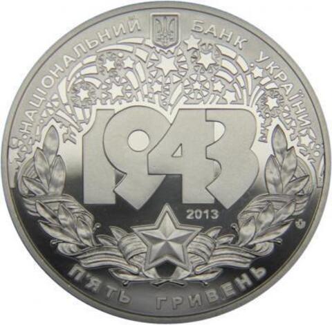 Аверс: Малый Государственный Герб Украины и надпись полукругом - "Национальный Банк Украины"; в центре - композиция, символизирующая победу: цифры 1943, над которыми - изображение салюта, внизу - лавровая ветвь с лентой ордена Славы и звездой, справа над звездой - год чеканки монеты 2013; внизу надпись полукругом - "Пять гривен" и логотип Монетного двора Национального банка Украины (справа).