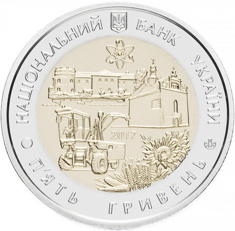 Аверс: Вверху малый Государственный Герб Украины, по кругу надписи: НАЦИОНАЛЬНЫЙ БАНК УКРАИНЫ (вверху), ПЯТЬ ГРИВЕН (внизу), справа - логотип Банкнотно-монетного двора Национального банка Украины; в центре-год чеканки монеты - 2017 и композиция, символизирующая область: вверху - символ мирного атома, под каким - замок Острожских в г. Староконстантинов, церковь святого Николая на территории Меджибожской крепости (справа), символический букет из сельскохозяйственной продукции - подсолнечника, зерновых, кукурузы (внизу) и кормоуборочный комбайн (слева).