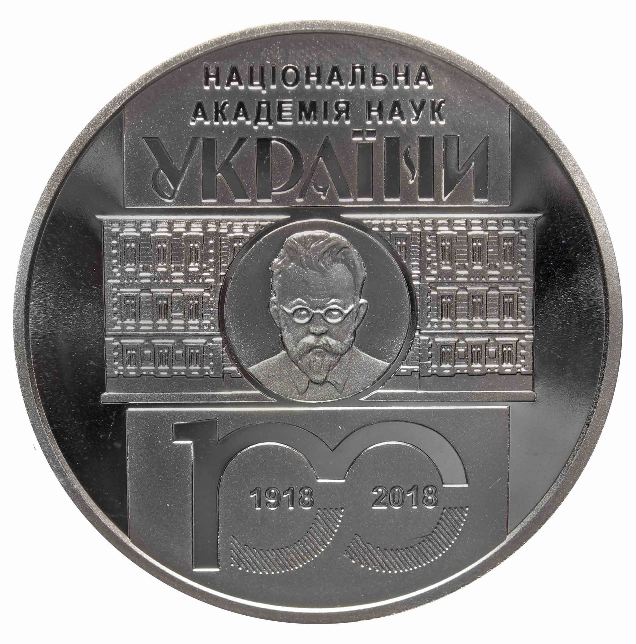 Реверс: портрет Владимира Вернадского на фоне здания Президиума Национальной академии наук Украины, над которой надписи: НАЦИОНАЛЬНЫЙ/ АКАДЕМИЯ НАУК/ УКРАИНЫ; внизу изображена стилизованная цифру 100, в нули которой вписано годы: 1918 и 2018.