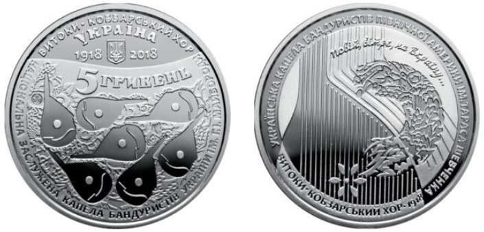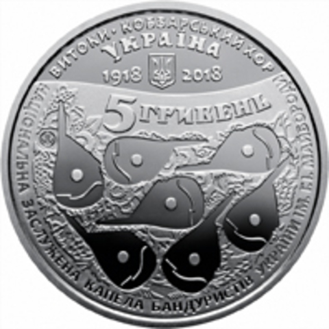 Аверс: вверху на зеркальном фоне надпись УКРАИНА, под которым - малый Государственный Герб Украины, по обе стороны от которого годы: 1918 и 2018, на рельефном фоне-номинал монеты - 5 ГРИВЕН, под которым стилизованная композиция: на фоне цветочного орнамента - семь бандур; по кругу надписи: ИСТОКИ o КОБЗАРСКИЙ ХОР (вверху); НАЦИОНАЛЬНАЯ ЗАСЛУЖЕННАЯ КАПЕЛЛА БАНДУРИСТОВ УКРАИНЫ ИМ. Г. И. МАЙБОРОДЫ; логотип Банкнотно-монетного двора Национального банка Украины (слева).