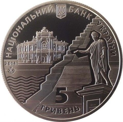 Аверс: изображение памятника Дюку Ришелье на фоне Потемкинской лестницы, Одесского национального академического театра оперы и балета, под которым - стилизованные волны. Внизу обозначен номинал монеты “5 ГРИВЕНЬ”. Вверху аверса монеты выгравирован малый Государственный Герб Украины и надпись “НАЦІОНАЛЬНИЙ БАНК УКРАЇНИ”. Слева обозначен логотип Монетного двора Национального банка Украины и год эмиссии “2014”.