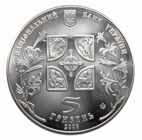 На аверсе монеты изображена стилизированная обложка Евангелие и православный крест, по бокам выгравированы лилии, символизирующие Деву Марию. Вверху монеты полукругом надпись “Національний банк України”, и герб Украины, внизу указан номинал монеты (5 гривен), год выпуска (2008), и отметка монетного двора НБУ.