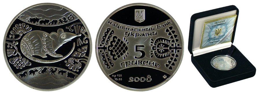5 гривен Год крысы Восточный календарь. Украина 2008 год