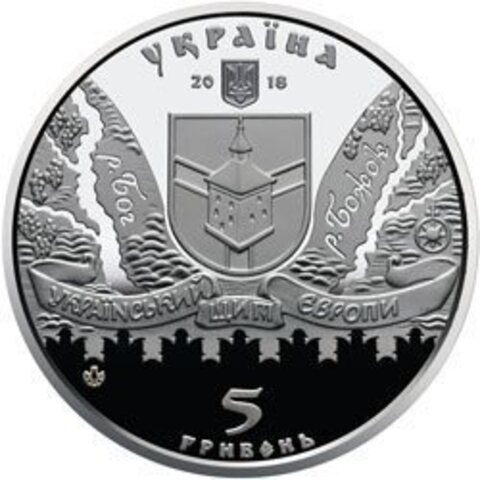 Аверс: вверху надпись - УКРАИНА, под которым малый Государственный Герб Украины, по обе стороны которого цифры 20 и 18, в центре композиция: щит с изображением башни, по обе стороны которого стилизованная карта местности с надписями: г. Бог (слева), г. Божок (справа) - древнее написание названий рек, внизу на ленте надпись - УКРАИНСКИЙ ЩИТ ЕВРОПЫ; внизу на фоне абриса зубцов дворца номинал - 5/ГРИВЕН, слева-логотип Банкнотно-монетного двора Национального банка Украины.
