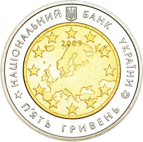 Аверс: Во внутреннем круге в обрамлении пятиконечных звезд изображена карта Европы, под верхней звездой – год чеканки монеты 2009, по внешнему кругу вверху размещен малый Государственный Герб Украины и надписи по кругу НАЦІОНАЛЬНИЙ БАНК УКРАЇНИ, П’ЯТЬ ГРИВЕНЬ (внизу) и логотип Монетного двора НБУ.