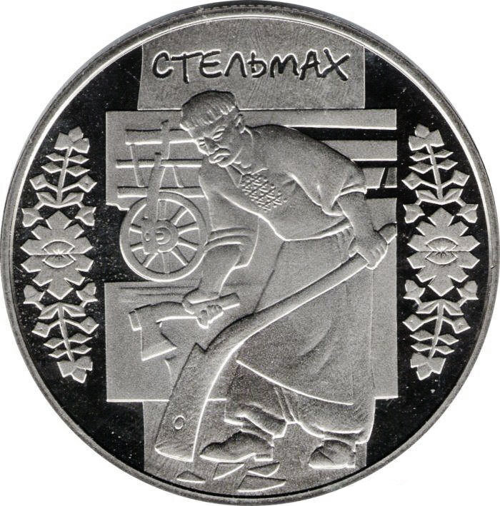 Монета посвящена профессии деревообработчика. Стельмаство, основное назначение которого - изготовление колес, саней, телег, дуг и т.д., известно в Украине издавна и было одним из самых распространенных промыслов.