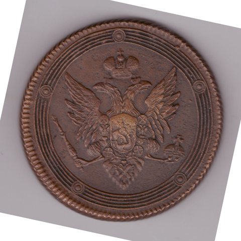 Реверс: В центре надпись — слово «КОПЕЕКЪ». Над надписью — цифра «5.». Под надписью — фигурная черта, под ней — дата выпуска монеты «1808.». Одна над цифрой, две по сторонам надписи и две под датой, равномерно расположены счётные знаки пяти копеек — пять окантованных точек, размещенных на пятилинейном ободке, проходящем вдоль канта.