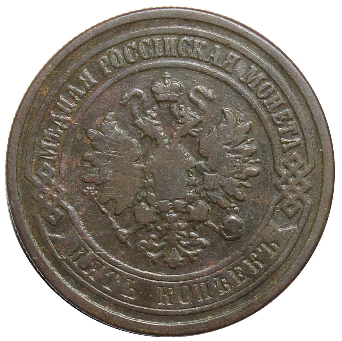 Аверс: В центре монеты изображен Малый Государственный Герб Российской империи - двуглавый орел, головы которого увенчаны двумя коронами, третья, большая корона над ними. Все они соединены лентой Андрея Первозванного. В правой лапе орла – скипетр, в левой – держава. На его груди расположен Московский герб, в щите изображен Георгий Победоносец с копьем поражающий дракона. Вокруг щита цепь ордена Св. Апостола Андрея Первозванного. На крыльях орла изображены гербы: Царства Казанского, Польского, Херсонеса Таврического, Астраханского, Сибирского, Грузинского и герб соединенных княжеств Киевского, Новгородского и Владимирского — по 4 на каждое крыло. По окружности - две полукруглые плашки, соединенные узорами. На верхней плашке выпуклая надпись: "МЕДНАЯ РОССИЙСКАЯ МОНЕТА". На нижней плашке, изображенной в виде ленты, углубленная надпись: "ПЯТЬ КОПЕЕК".