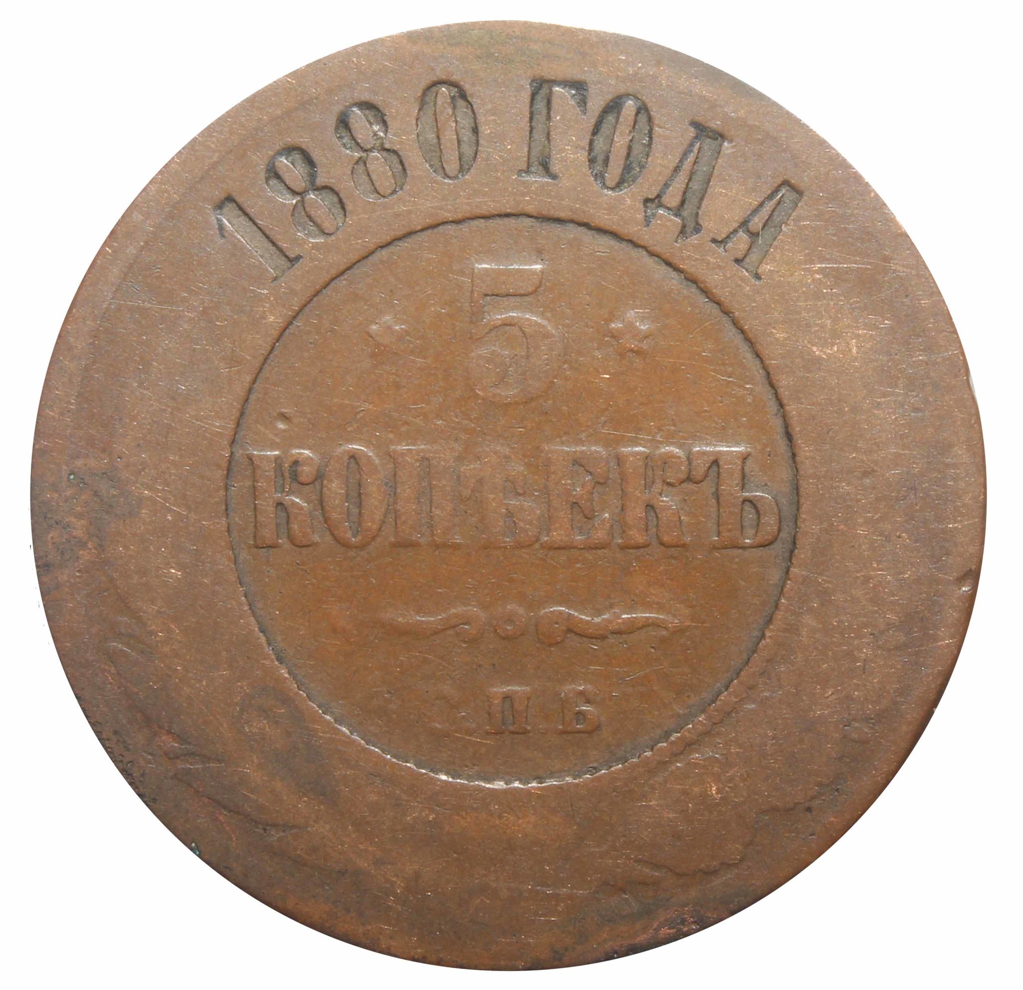 Реверс: вверху вдоль края монеты обозначение год выпуска «1880 ГОДА» ниже слева вдоль края монеты лавровая ветвь, справа дубовая, внизу ветви соединяются и перевязаны лентой, в середине в ободке из точек обрамленный слева и справа звездочками номинал монеты - цифра «5», ниже слово «КОПЕЕК», под ним две направленные в разные стороны фигурные черты, ниже обозначение монетного двора «СПБ».