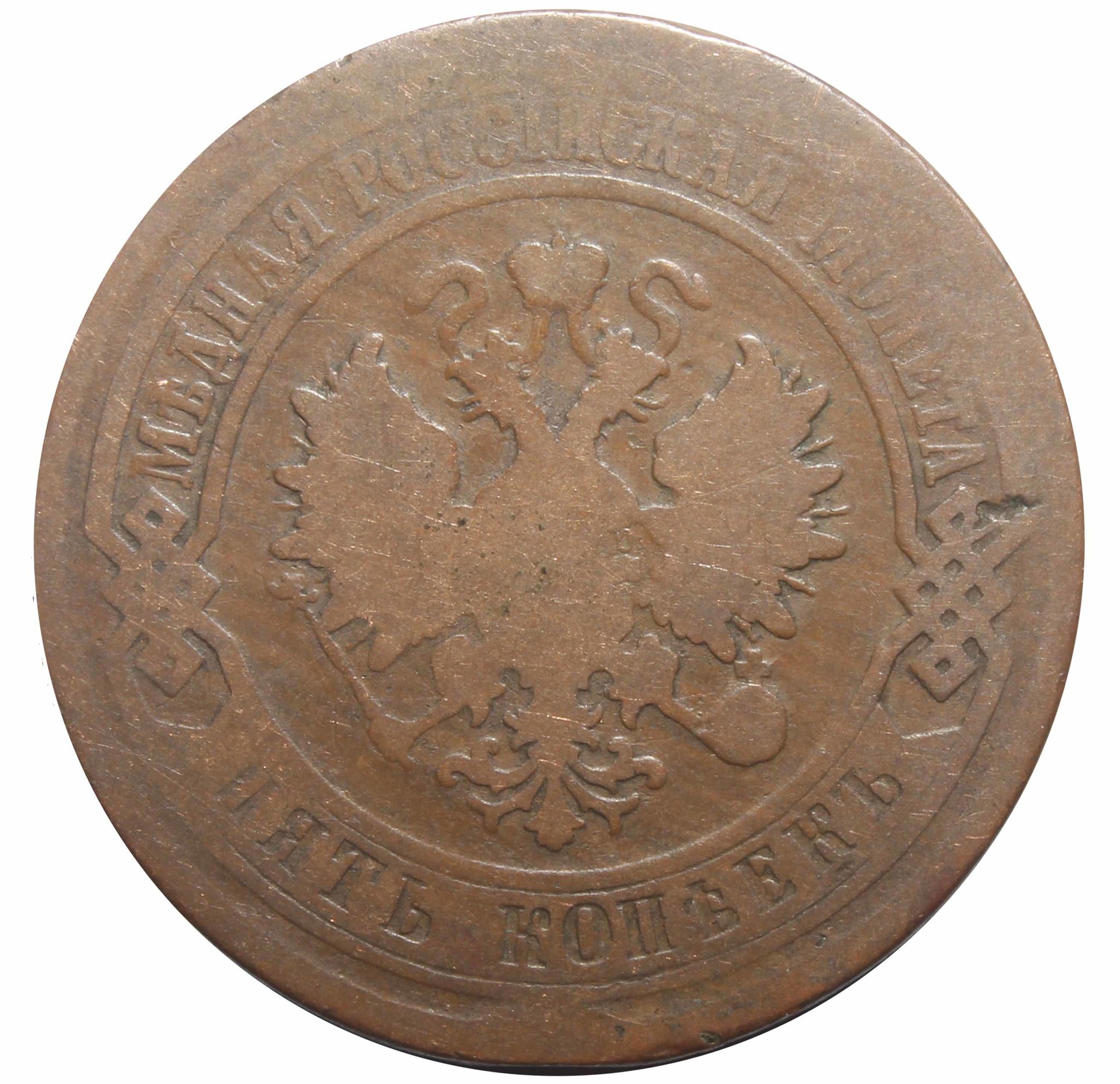 Аверс: вверху вдоль края монеты в выделенной выступающей рамкой полосе надпись «МЕДНАЯ РОССИЙСКАЯ МОНЕТА», внизу вдоль края монеты в выступающей рамке, соединённой с верхней рамкой расположенными слева и справа фигурными решетками, на выступающей плашке вдавленными буквами обозначение номинала монеты «ПЯТЬ КОПЕЕК», в середине Малый Государственный Герб Российской империи.