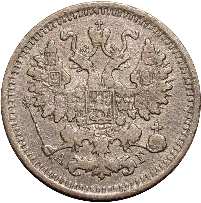 В центре указан номинал «5», ограниченный с обеих сторон шестиконечными звездочками. Над цифрой – Корона Российской империи. Под цифрой номинала — слово "КОПЕЕК". Ниже, расположен декоративный разделитель в виде двух разнонаправленных фигурных линий и стилизованным из точек крестом между ними. Под разделителем — дата выпуска монеты «1888». Под цифрой даты — обозначение монетного двора «С.П.Б.». Вдоль канта, не доходя до короны, изображен венок из лавровой и дубовой ветви, которые в нижней части перевязаны лентой на узел бантом. По окружности канта имеются рельефные элементы, выполненные в виде зубцов.