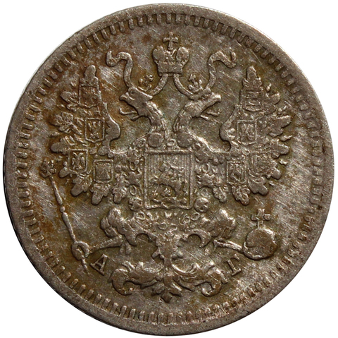 В центре указан номинал «5», ограниченный с обеих сторон шестиконечными звездочками. Над цифрой – Корона Российской империи. Под цифрой номинала — слово "КОПЕЕК". Ниже, расположен декоративный разделитель в виде двух разнонаправленных фигурных линий и стилизованным из точек крестом между ними. Под разделителем — дата выпуска монеты «1891». Под цифрой даты — обозначение монетного двора «С.П.Б.». Вдоль канта, не доходя до короны, изображен венок из лавровой и дубовой ветви, которые в нижней части перевязаны лентой на узел бантом. По окружности канта имеются рельефные элементы, выполненные в виде зубцов.