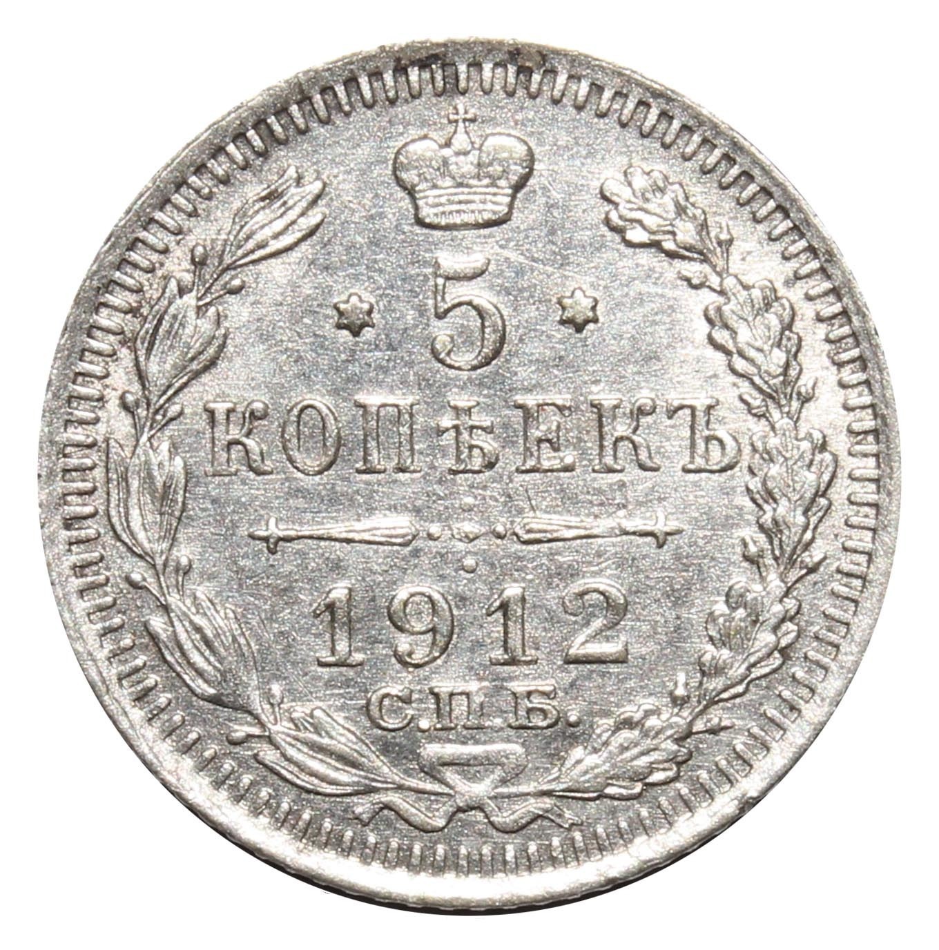 Реверс: слева вдоль края монеты лавровая ветвь, справа дубовая, внизу ветви соединяются и перевязаны лентой, в середине вверху Корона Российской империи, под ней обрамленный слева и справа звездочками номинал монеты - цифра «5», ниже слово «КОПЕЕК», под ним две направленные в разные стороны фигурные черты и ниже год выпуска монеты «1912», под ним обозначение монетного двора «СПБ».