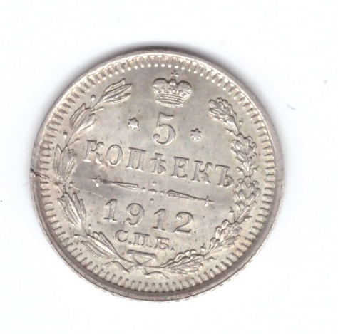 В центре указан номинал «5», ограниченный с обеих сторон звездочками. Над цифрой – Корона Российской империи. Под цифрой номинала — слово "КОПЕЕК". Ниже, расположен декоративный разделитель в виде двух разнонаправленных фигурных линий и стилизованным из точек крестом между ними. Под разделителем — дата выпуска монеты «1912». Под цифрой даты — обозначение монетного двора «С.П.Б.». Вдоль канта, не доходя до короны, изображен венок из лавровой и дубовой ветви, которые в нижней части перевязаны лентой на узел бантом. По окружности канта имеются рельефные элементы, выполненные в виде зубцов.