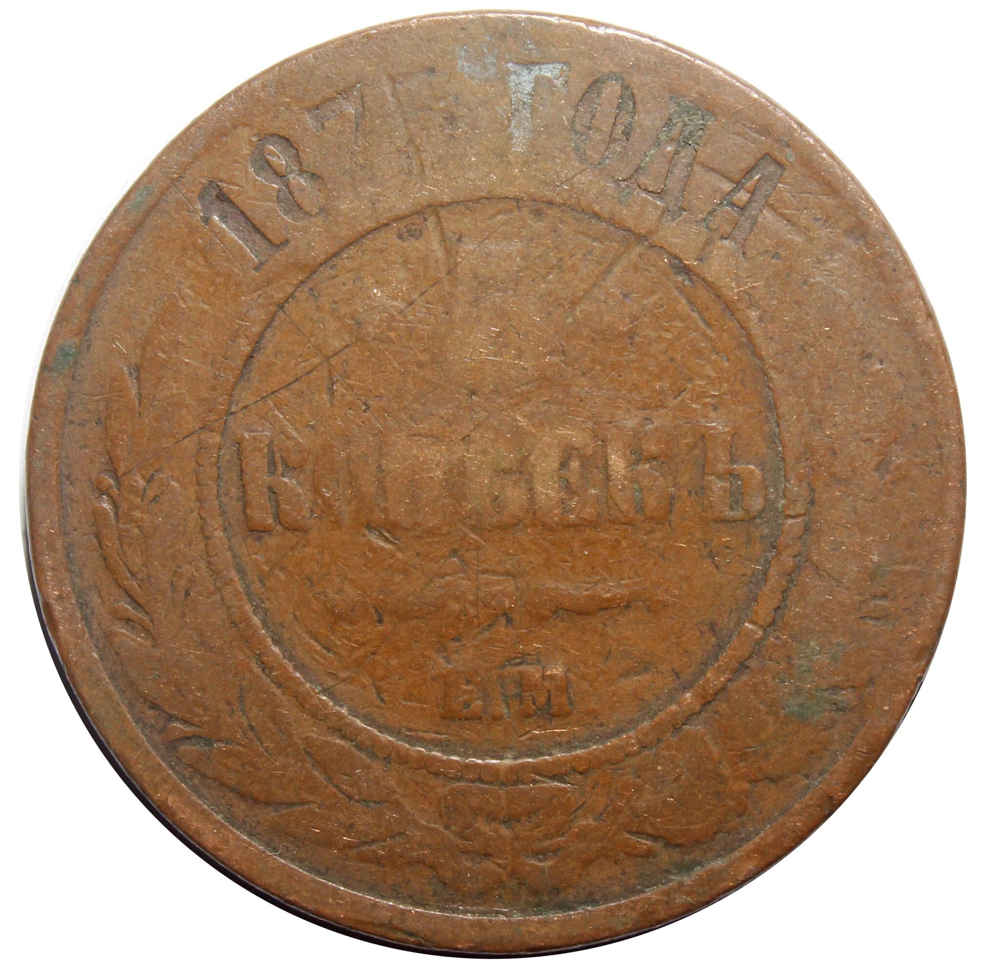 Реверс: в центре указан номинал «5», ограниченный с обеих сторон звездочками. Под цифрой номинала слово — "КОПЕЕК". Ниже, расположен декоративный разделитель в виде двух изогнутых линий и небольшой окружности между ними. Под линиями обозначение монетного двора «Е.М.». Центральная часть отделена от остального изображения, окружностью в виде точек. В верхней части по кругу углубленная надпись: "1875 ГОДА". Вдоль канта изображен венок из лавровой и дубовой ветви, которые в нижней части перевязаны лентой на узел бантом.
