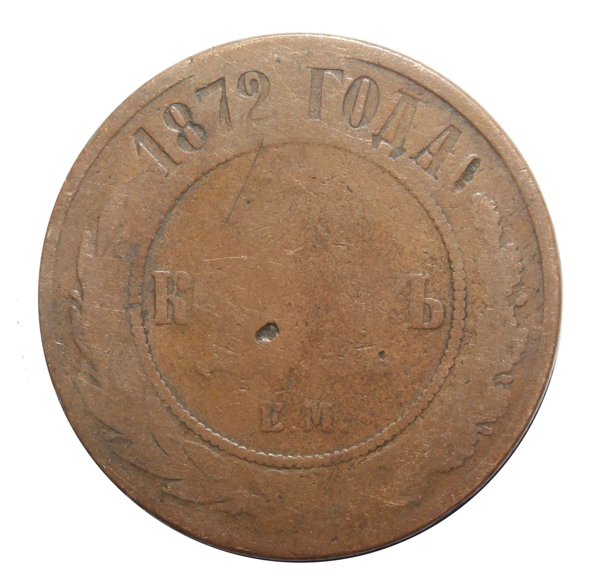 Реверс: вверху вдоль края монеты обозначение год выпуска «1872 ГОДА» ниже слева вдоль края монеты лавровая ветвь, справа дубовая, внизу ветви соединяются и перевязаны лентой, в середине в ободке из точек обрамленный слева и справа звездочками номинал монеты - цифра «5», ниже слово «КОПЕЕК», под ним две направленные в разные стороны фигурные черты, ниже обозначение монетного двора «ЕМ».