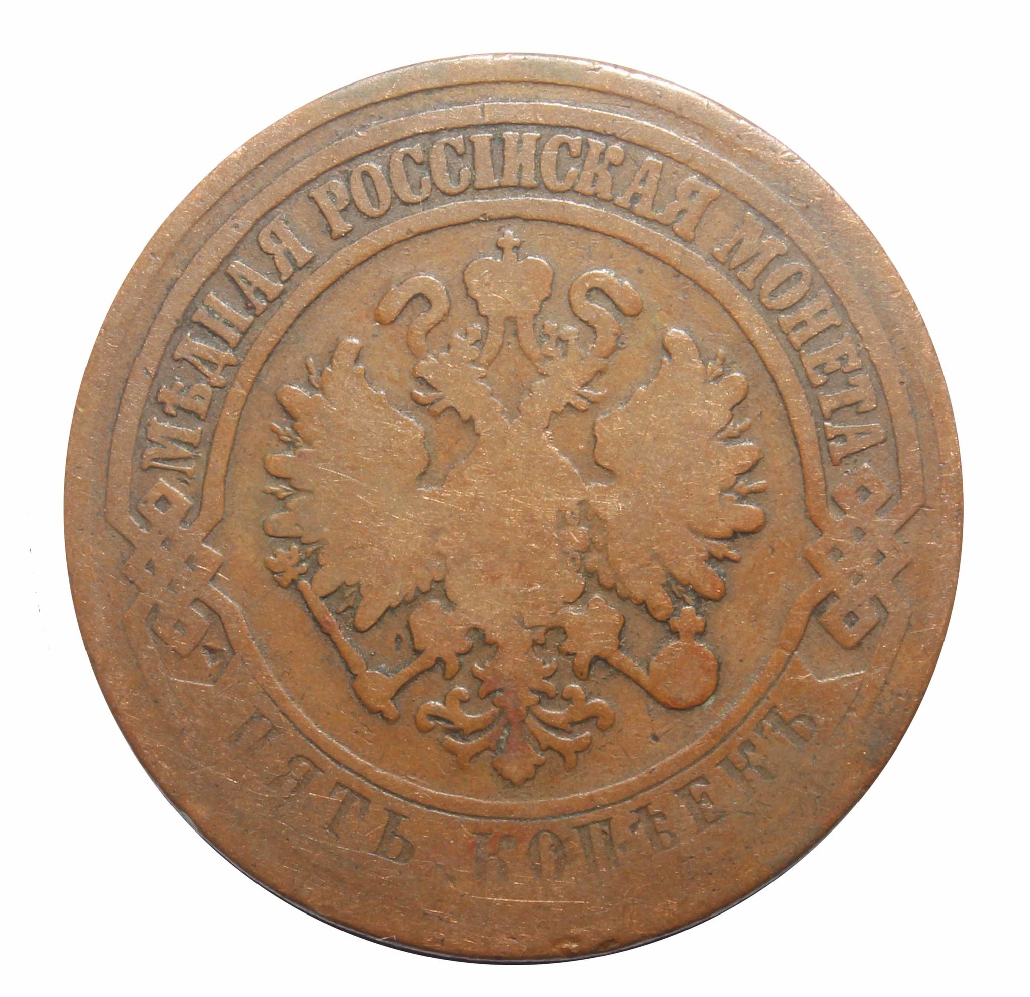 Аверс: вверху вдоль края монеты в выделенной выступающей рамкой полосе надпись «МЕДНАЯ РОССИЙСКАЯ МОНЕТА», внизу вдоль края монеты в выступающей рамке, соединённой с верхней рамкой расположенными слева и справа фигурными решетками, на выступающей плашке вдавленными буквами обозначение номинала монеты «ПЯТЬ КОПЕЕК», в середине Малый Государственный Герб Российской империи.