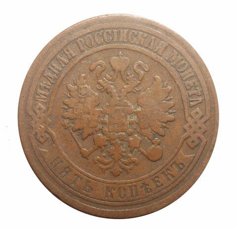 Аверс: вверху вдоль края монеты в выделенной выступающей рамкой полосе надпись «МЕДНАЯ РОССИЙСКАЯ МОНЕТА», внизу вдоль края монеты в выступающей рамке, соединённой с верхней рамкой расположенными слева и справа фигурными решетками, на выступающей плашке вдавленными буквами обозначение номинала монеты «ПЯТЬ КОПЕЕК», в середине Малый Государственный Герб Российской империи.