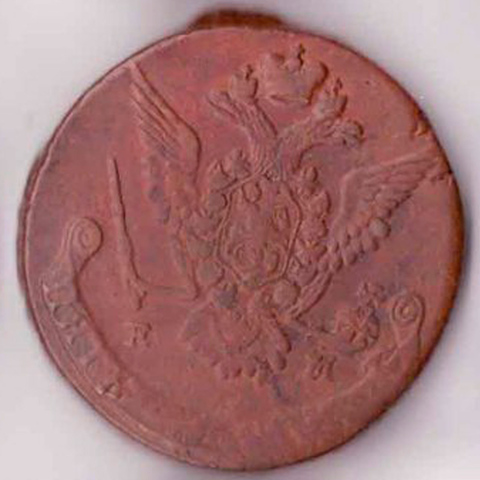 Пять копеек отчеканены на Екатеринбургском монетном дворе в период правления императрицы Екатерины Великой (1762 – 1796 гг.). С приходом к власти, Екатерина II изменила монетную стопу, действовавшую до неё. Теперь, медные номиналы, чеканили из расчета 16 рублей, а не как раньше 32 руб., из пуда меди. Все медные, «арматурные» деньги, выпущенные столь ненавистным ей мужем, подвергались изъятию из оборота и перечеканки в более полновесные монеты.