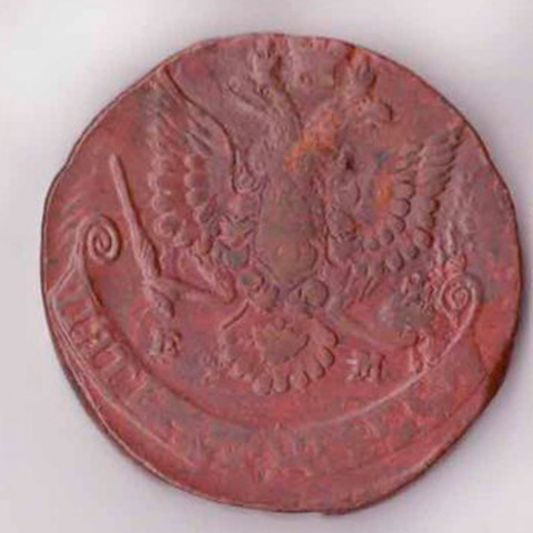 Пять копеек отчеканены на Екатеринбургском монетном дворе в период правления императрицы Екатерины Великой (1762 – 1796 гг.). С приходом к власти, Екатерина II изменила монетную стопу, действовавшую до неё. Теперь, медные номиналы, чеканили из расчета 16 рублей, а не как раньше 32 руб., из пуда меди. Все медные, «арматурные» деньги, выпущенные столь ненавистным ей мужем, подвергались изъятию из оборота и перечеканки в более полновесные монеты.