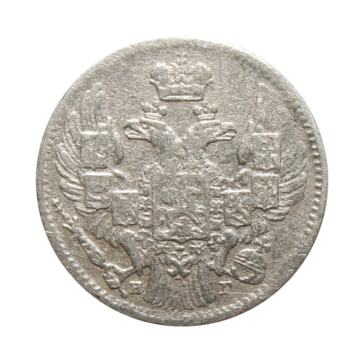 Аверс: В центре изображен Государственный Герб Российской империи - двуглавый орёл с распростёртыми и опущенными вниз крыльями. Над головами орла - императорская корона. На груди орла расположен Московский герб - щит с изображением Георгия Победоносца, поражающего копьем дракона. Орёл держит, перевитые орденской лентой ордена Св. Апостола Андрея Первозванного, громовые стрелы и факел в правой лапе и лавровый венок — в левой. Под лентой буквы Инициалы минцмейстера. Под инициалами — дата выпуска монеты «1833.»