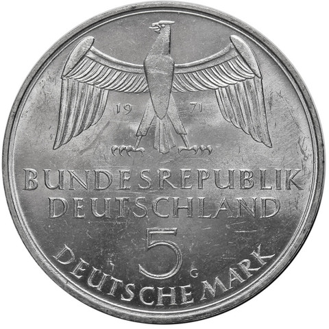 5 марок 1971 (G) Германия (100 лет объединению Германии) AU серебро