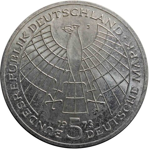 5 марок. 500 лет со дня рождения Николая Коперника. Германия. (J). Серебро. 1973 год. AU