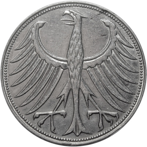 5 марок. Германия. (F). Серебро. 1957 год. VF