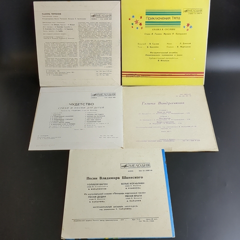 №5 Набор из 10 виниловых пластинок 7 дюймов миньоны детские сказки и песни: Песни Владимира Шаинского / По щучьему велению / А может быть ворона / Гуси - лебеди / песни из сказки Маша и Витя против диких гитар / Кто сказал Мяу? / Курочка Ряба / Бумчик и барабан / Приключения Тяпа / Чудетство - стихи и песни для детей / Камень терпения . 10 Виниловых пластинок 7 дюймов. Мелодия СССР. Конверты EX / Диски EX