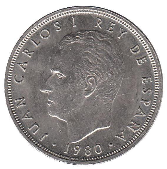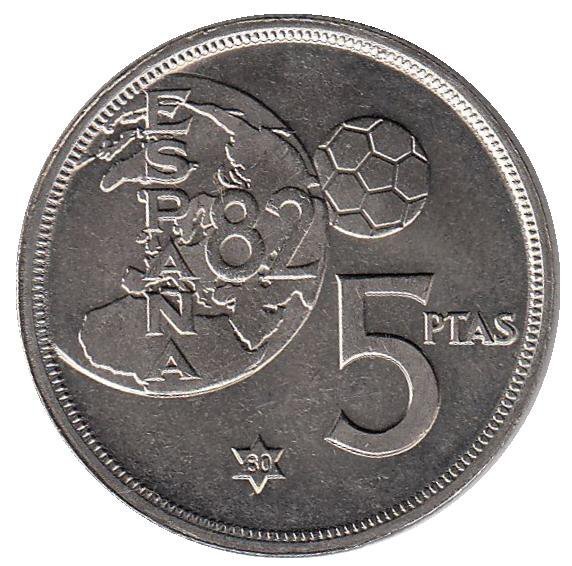5 песет 1980 год. Испания. Чемпионат мира по футболу в Испании 1982. Футбол. Спорт. 80 внутри звезды. XF/aUNC/UNC