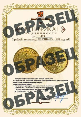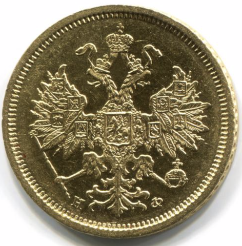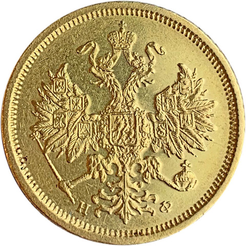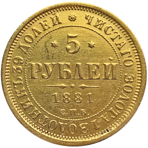 5 РУБЛЕЙ 1881 года, СПБ-HФ. Золото 6,51 г. Уздеников № 0280 (точка). Биткин № 1. Казаков № 546.
