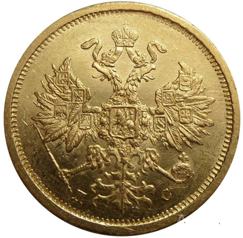 Реверс: по кругу вдоль края монеты надпись, разделенная вверху звездой, «ЧИСТОГО ЗОЛОТА 1 ЗОЛОТНИК 39 ДОЛЕЙ», в середине в точечном ободке сверху обозначение номинала монеты цифра «5», слева и справа от нее звездочки, ниже слово «РУБЛЕЙ», под ним две смотрящие в разные стороны черты, разделенные точкой, ниже год выпуска монеты «1883» и внизу у точечного ободка обозначение Санкт-Петербургского монетного двора «СПБ».