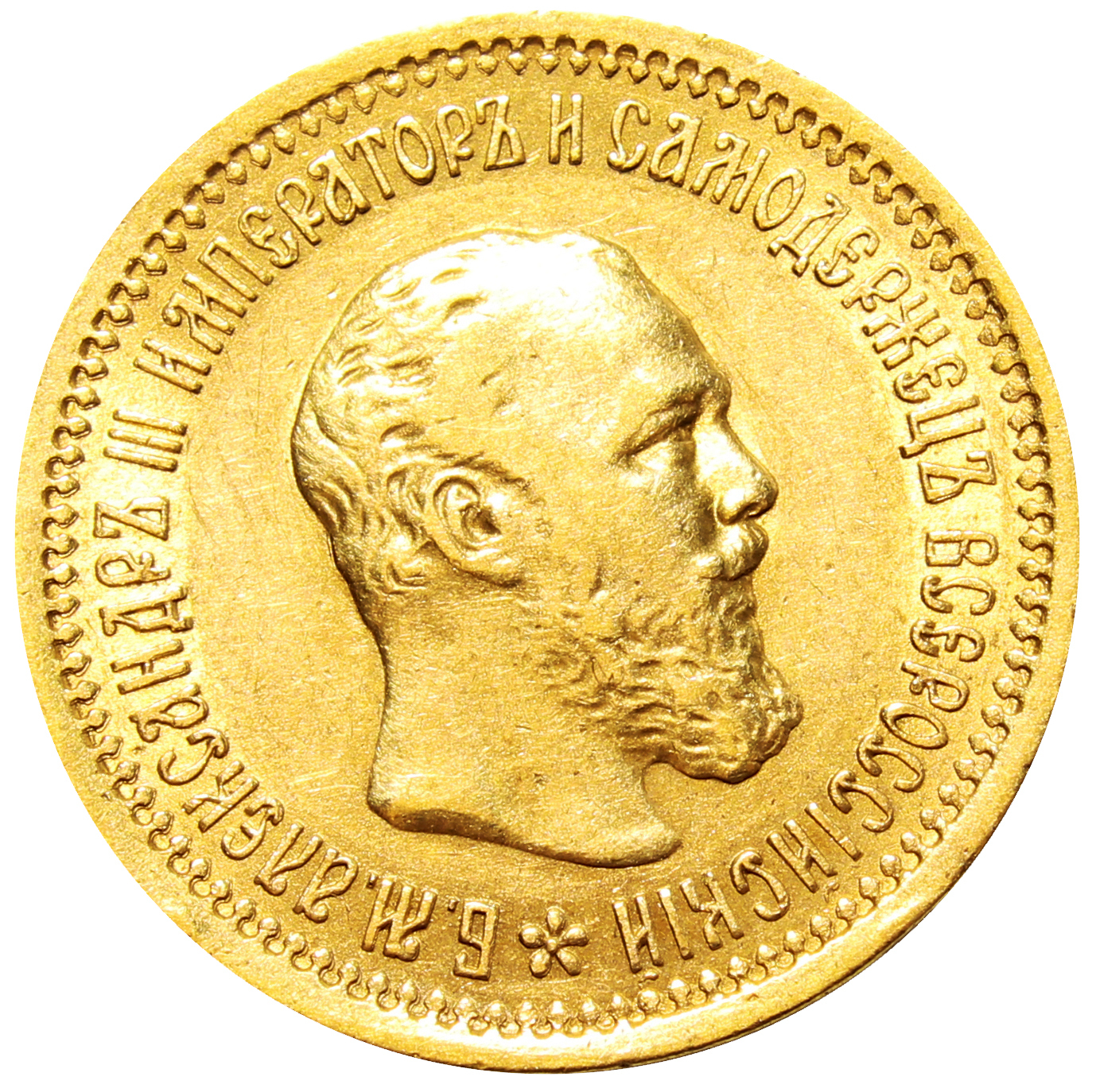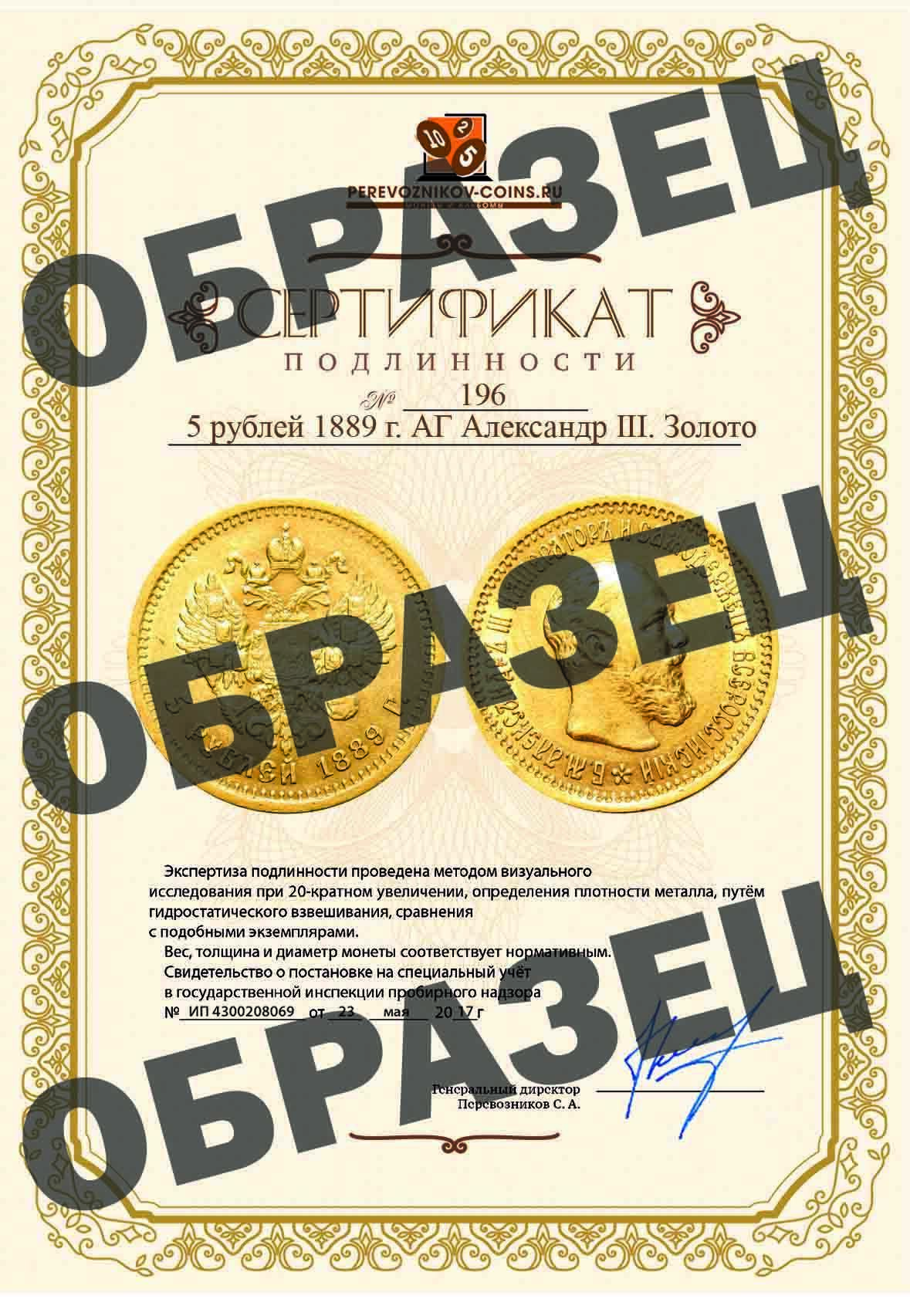 Реверс: В центре изображен Малый Государственный Герб Российской империи - двуглавый орёл, головы которого увенчаны двумя коронами, третья, большая корона над ними. Все они соединены орденской лентой ордена Св. апостола Андрея Первозванного. На груди орла расположен Московский герб - щит с изображением Георгия Победоносца с копьём поражающего дракона. Вокруг щита цепь ордена Св. апостола Андрея Первозванного. На крыльях изображены гербы: Царства Казанского, Польского, Херсонеса Таврического, Астраханского, Сибирского, Грузинского и герб соединенных княжеств Киевского, Новгородского и Владимирского — по 4 на каждое крыло. В правой лапе орла – скипетр, в левой – держава. Под ним слева направо изображены: номинал - надпись «5 РУБЛЕЙ» и дата выпуска «1889 Г.». По окружности канта имеются рельефные элементы, выполненные в виде зубцов.
