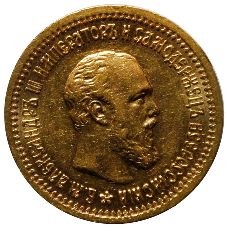 Реверс: В центре изображен Малый Государственный Герб Российской империи - двуглавый орёл, головы которого увенчаны двумя коронами, третья, большая корона над ними. Все они соединены орденской лентой ордена Св. апостола Андрея Первозванного. На груди орла расположен Московский герб - щит с изображением Георгия Победоносца с копьём поражающего дракона. Вокруг щита цепь ордена Св. апостола Андрея Первозванного. На крыльях изображены гербы: Царства Казанского, Польского, Херсонеса Таврического, Астраханского, Сибирского, Грузинского и герб соединенных княжеств Киевского, Новгородского и Владимирского — по 4 на каждое крыло. В правой лапе орла – скипетр, в левой – держава. Под ним слева направо изображены: номинал - надпись «5 РУБЛЕЙ» и дата выпуска «1889 Г.». По окружности канта имеются рельефные элементы, выполненные в виде зубцов.