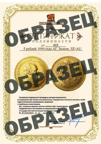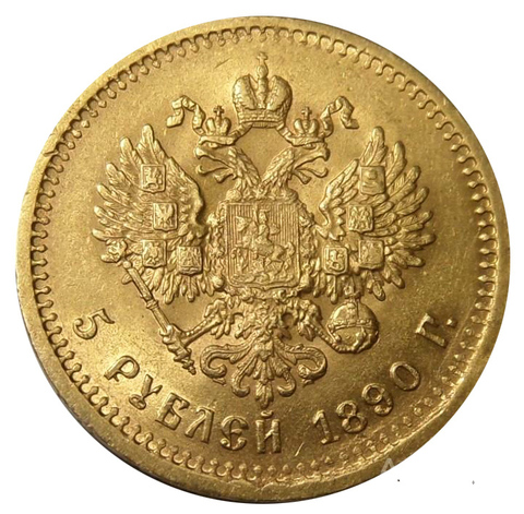 Аверс: в середине Малый Государственный Герб Российской империи, под ним вдоль края монеты номинал «5 РУБЛЕЙ» и год выпуска монеты «1890 Г.».