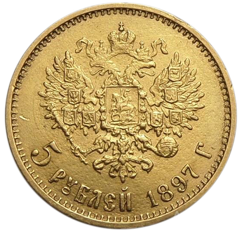 Реверс: В центре изображен Малый Государственный Герб Российской империи - двуглавый орёл, головы которого увенчаны двумя коронами, третья, большая корона над ними. Все они соединены орденской лентой ордена Св. Апостола Андрея Первозванного. На груди орла расположен Московский герб, в щите изображен Георгий Победоносец с копьем поражающий дракона. Вокруг щита цепь ордена Св. Апостола Андрея Первозванного. На крыльях изображены гербы: Царства Казанского, Польского, Херсонеса Таврического, Астраханского, Сибирского, Грузинского и герб соединенных княжеств Киевского, Новгородского и Владимирского — по 4 на каждое крыло. В правой лапе орла – скипетр, в левой – держава. Под ним слева направо изображены: номинал - надпись «5 РУБЛЕЙ» и дата выпуска «1897 Г.». По окружности канта имеются рельефные элементы, выполненные в виде зубцов.