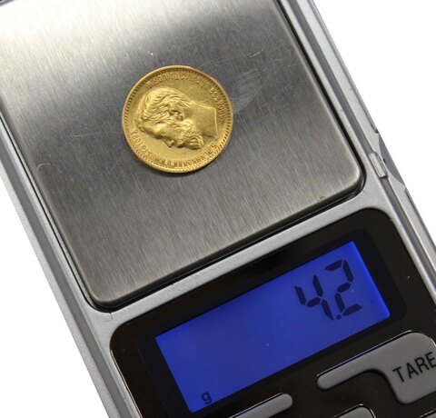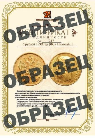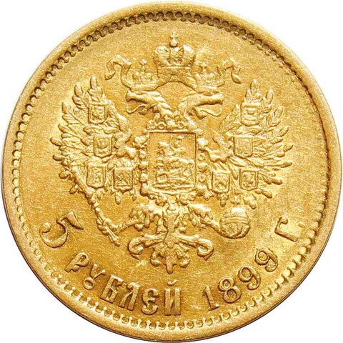 Аверс: в середине Малый Государственный Герб Российской империи, под ним вдоль края монеты номинал «5 РУБЛЕЙ» и год выпуска монеты «1899 Г.».