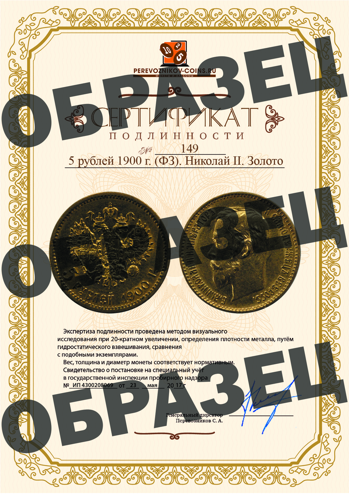 Реверс: В центре изображен Малый Государственный Герб Российской империи - двуглавый орёл, головы которого увенчаны двумя коронами, третья, большая корона над ними. Все они соединены орденской лентой ордена Св. Апостола Андрея Первозванного. На груди орла расположен Московский герб, в щите изображен Георгий Победоносец с копьем поражающий дракона. Вокруг щита цепь ордена Св. Апостола Андрея Первозванного. На крыльях изображены гербы: Царства Казанского, Польского, Херсонеса Таврического, Астраханского, Сибирского, Грузинского и герб соединенных княжеств Киевского, Новгородского и Владимирского — по 4 на каждое крыло. В правой лапе орла – скипетр, в левой – держава. Под ним слева направо изображены: номинал - надпись «5 РУБЛЕЙ» и дата выпуска «1900 Г.». По окружности канта имеются рельефные элементы, выполненные в виде зубцов.