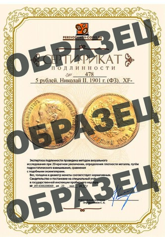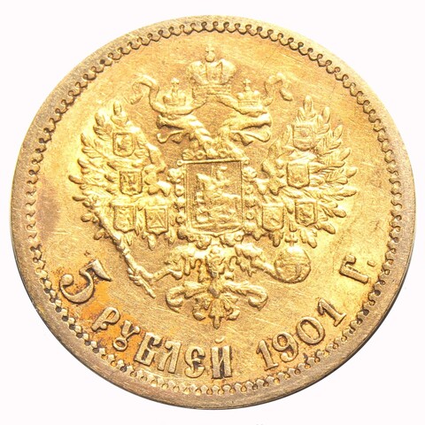 Реверс: В центре изображен Малый Государственный Герб Российской империи - двуглавый орёл, головы которого увенчаны двумя коронами, третья, большая корона над ними. Все они соединены орденской лентой ордена Св. Апостола Андрея Первозванного. На груди орла расположен Московский герб, в щите изображен Георгий Победоносец с копьем поражающий дракона. Вокруг щита цепь ордена Св. Апостола Андрея Первозванного. На крыльях изображены гербы: Царства Казанского, Польского, Херсонеса Таврического, Астраханского, Сибирского, Грузинского и герб соединенных княжеств Киевского, Новгородского и Владимирского — по 4 на каждое крыло. В правой лапе орла – скипетр, в левой – держава. Под ним слева направо изображены: номинал - надпись «5 РУБЛЕЙ» и дата выпуска «1901 Г.». По окружности канта имеются рельефные элементы, выполненные в виде зубцов.